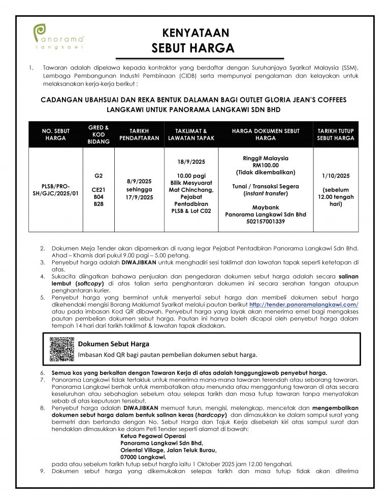 Penjelasan : Sebut Harga Cadangan Ubahsuai dan Reka Bentuk Bagi Outlet Gloria Jean’s Coffees Di Lot C02 OV