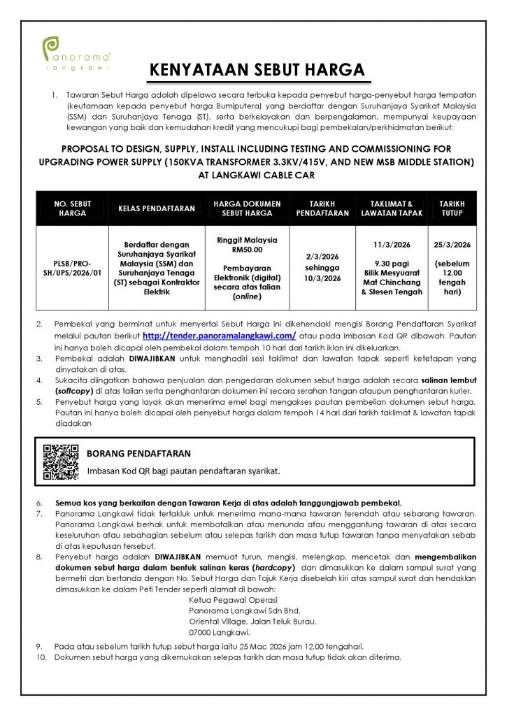 Penjelasan : Proposal To Design, Supply, Install Including Testing And Commisioning For Upgrading Power Supply (150KVA Transfomer 3.3KV/415V, And New MSB Middle Station) At Langkawi Cable Car